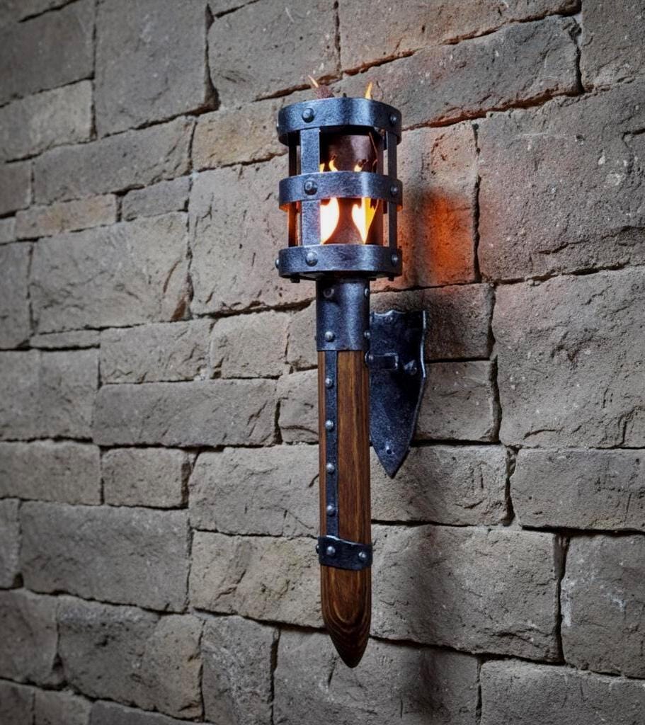 Medieval Wall Torch Sconce: Rustic Iron & Wood Viking Lantern