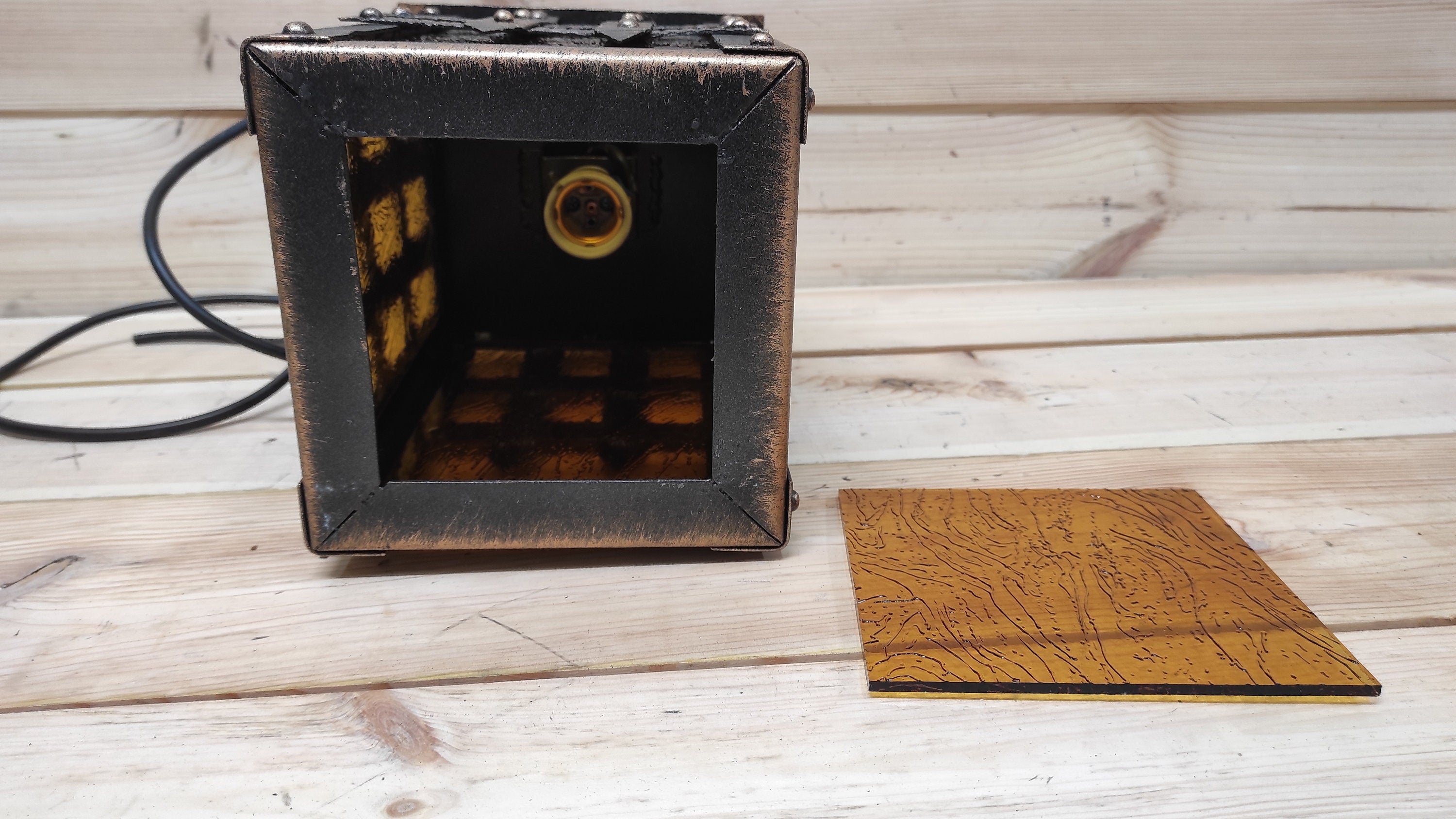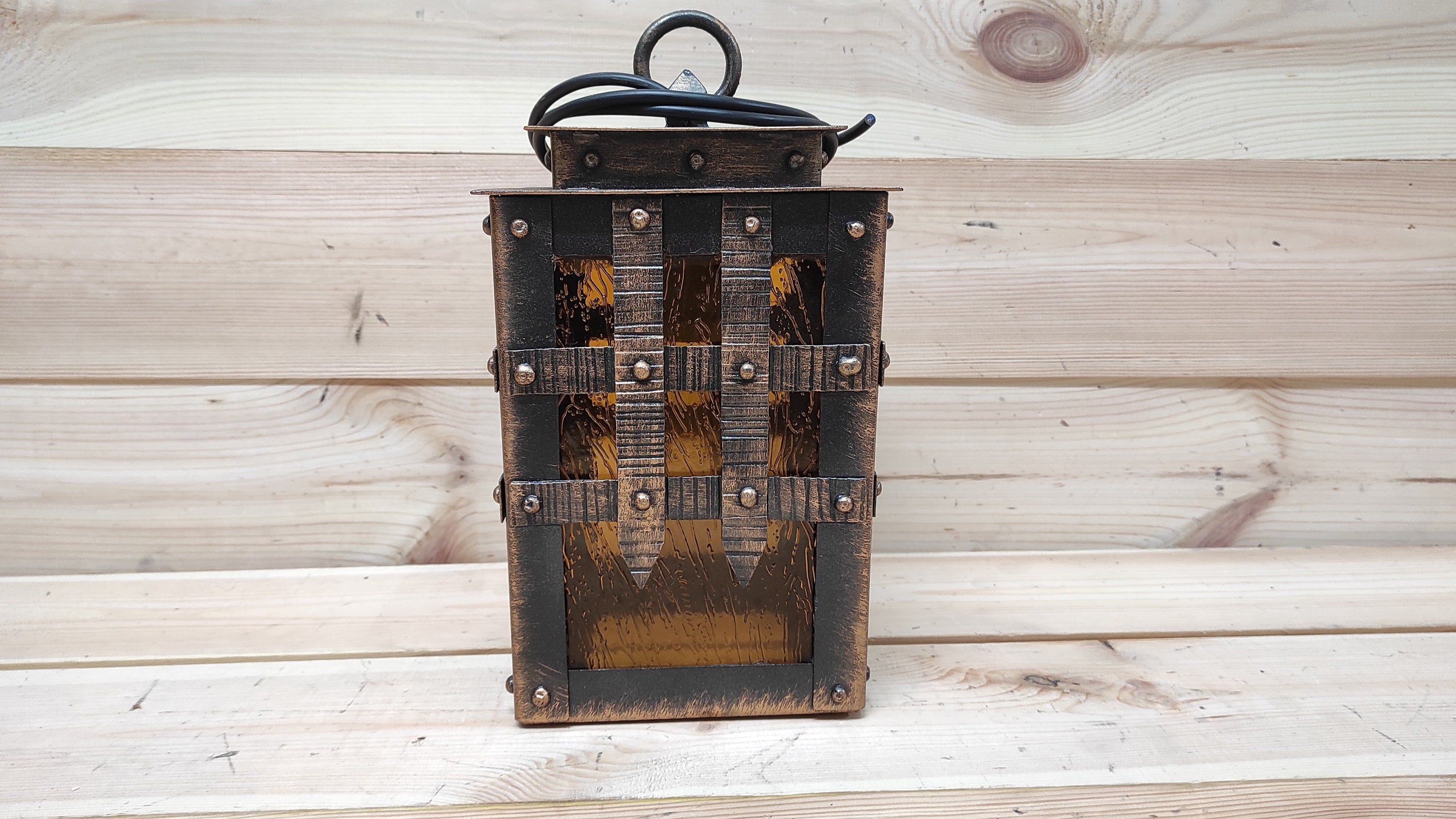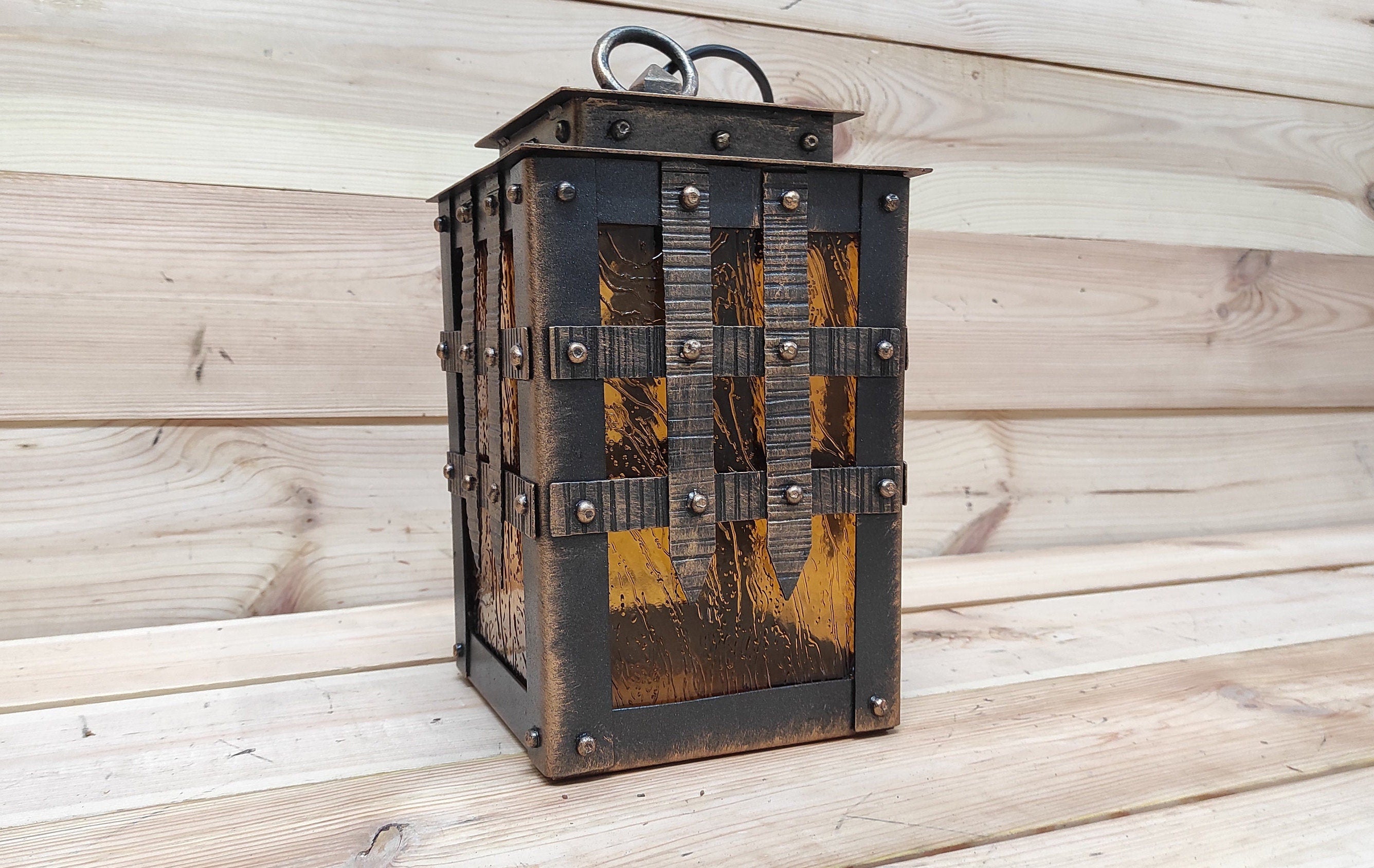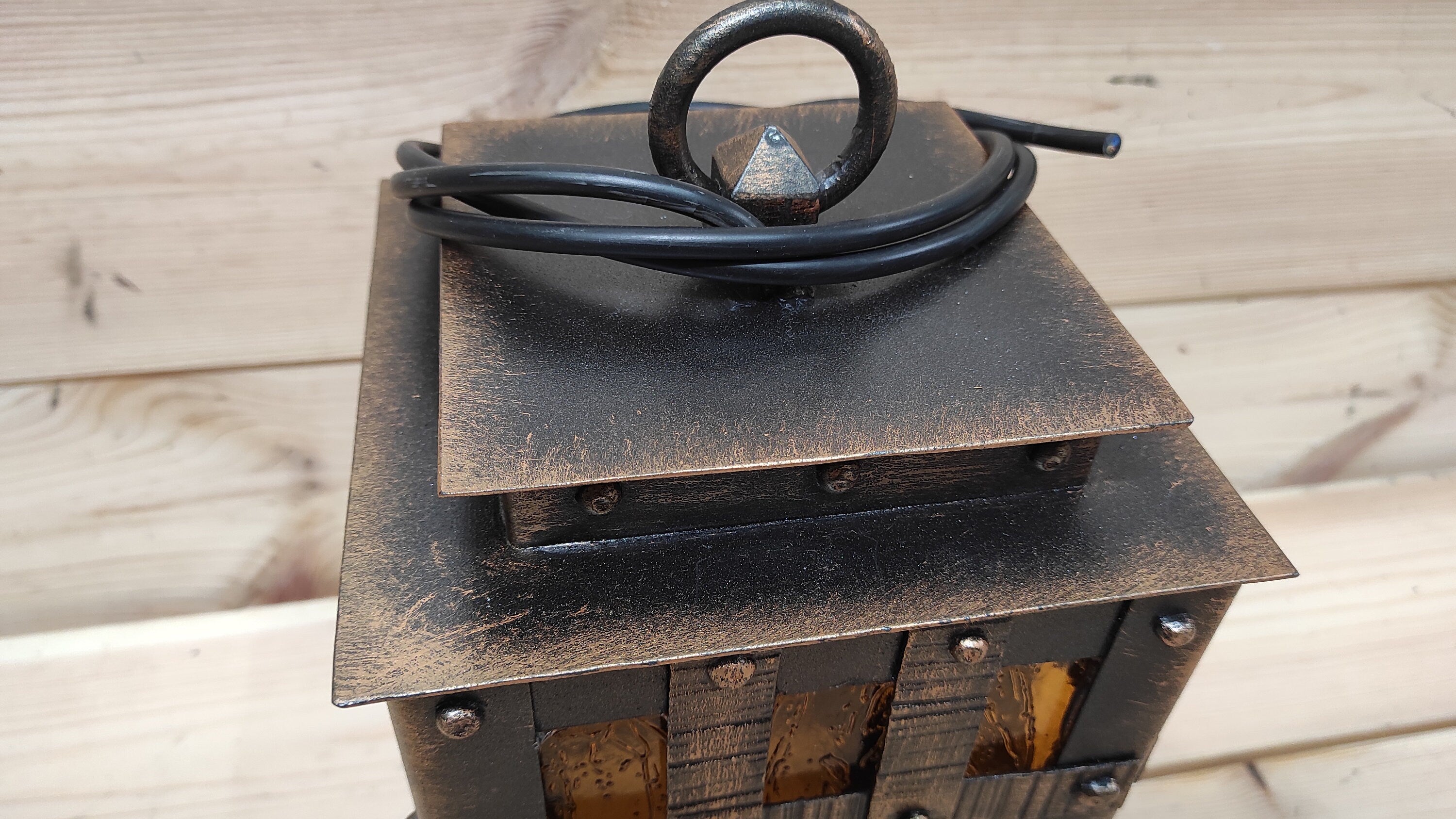 The forged lantern is sold with an electric cable without a plug and bulb. E26/E27 bulb socket.