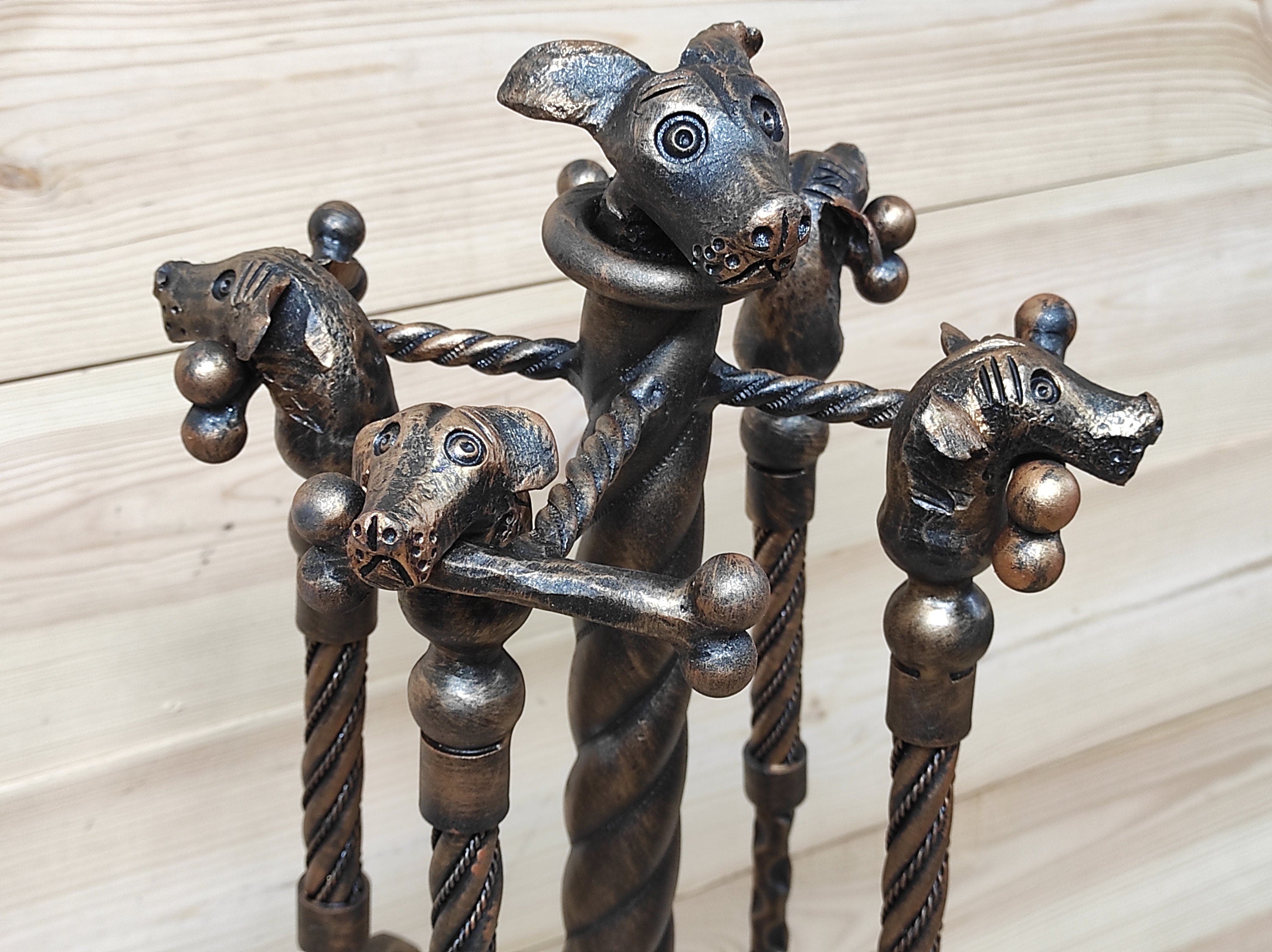 Hand Forged Fireplace Tool Set: Dog Decor, 4 Piece with Stand