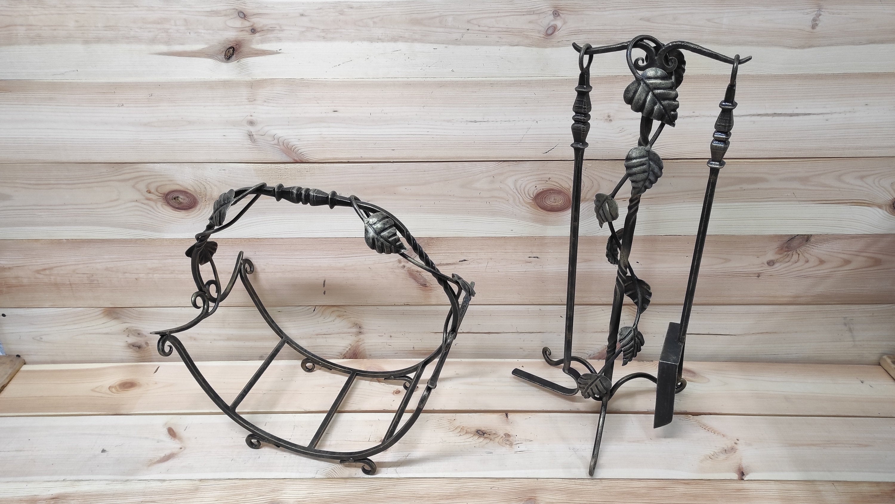 A set of forged fireplace tools 2 pieces + stand+ Firewood storage. Handmade.