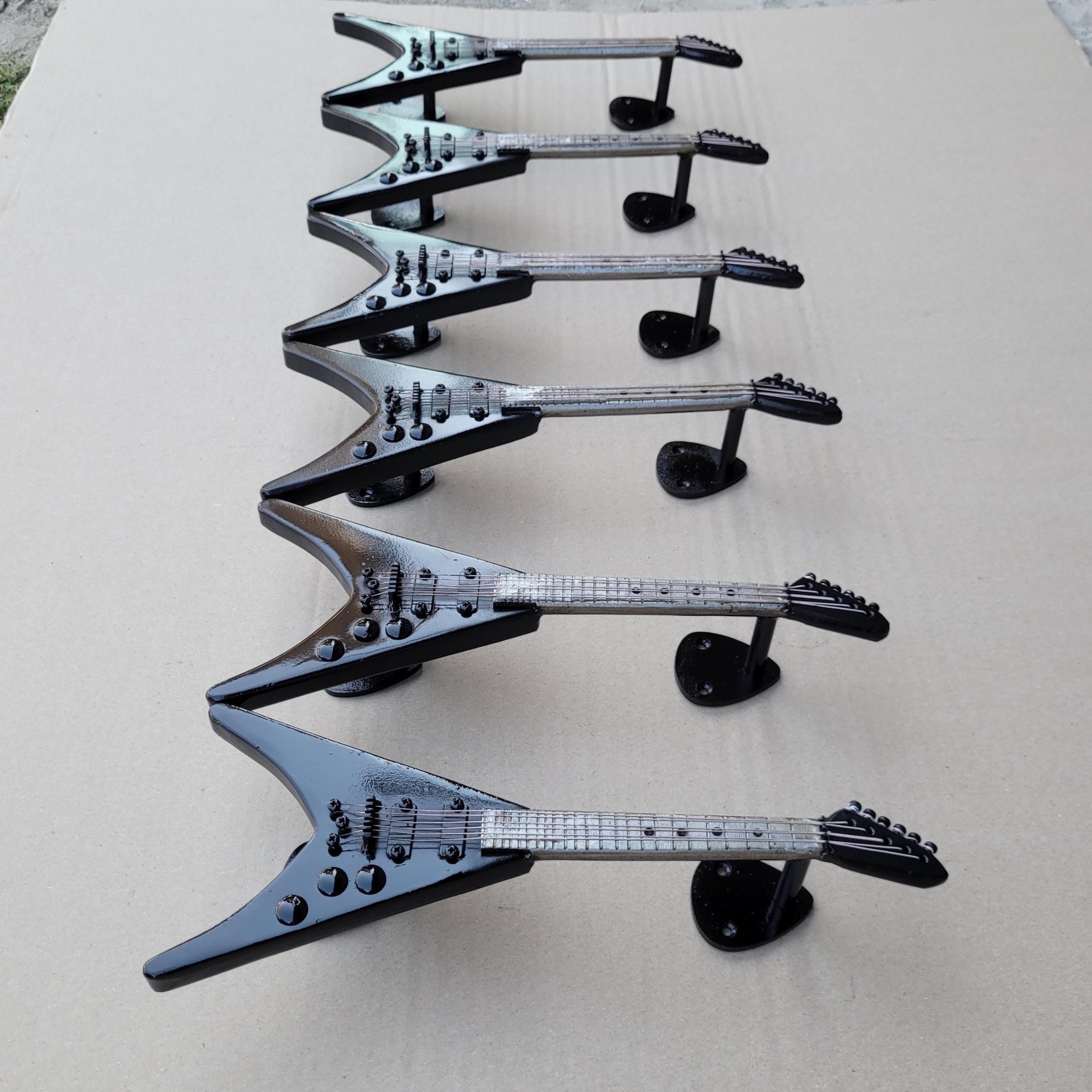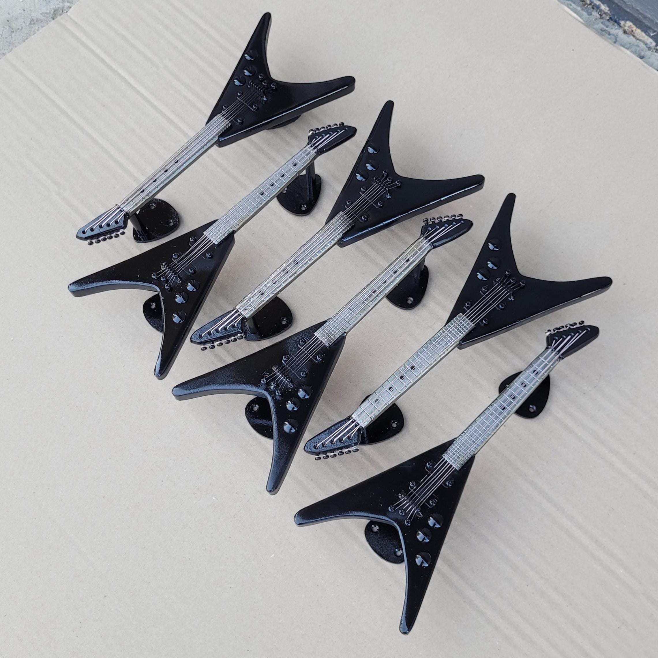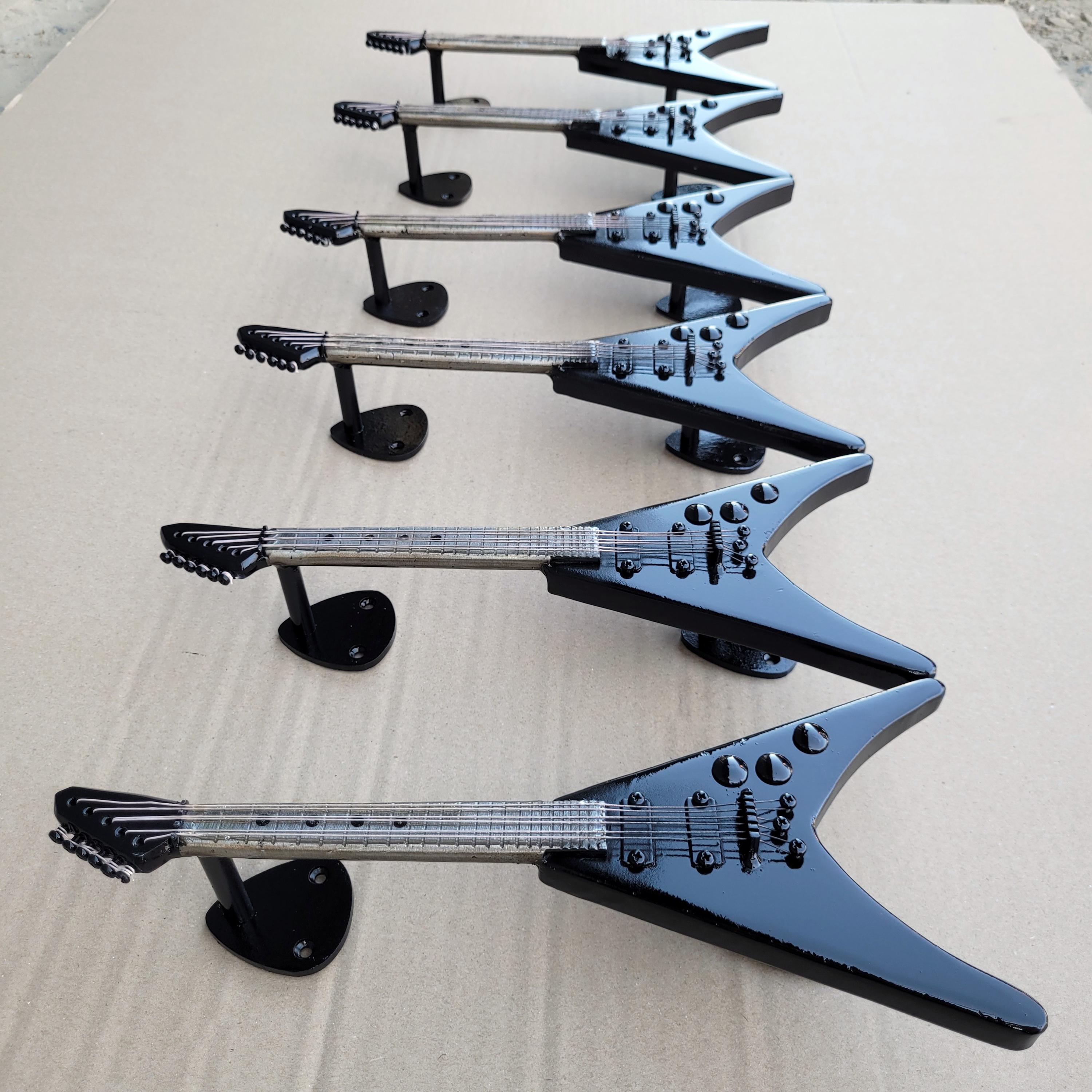 Handcrafted iron door handle in the shape of an electric guitar, a unique addition to any music lover's home. This guitar-shaped door handle features intricate, realistic strings that capture the essence of a true electric guitar. Designed in a striking black and silver color scheme, it adds a touch of rock 'n' roll elegance to your decor. Perfect for those searching for a "guitar-shaped door handle" or a "unique guitar door handle," this piece is not just functional but also a statement of your love for music. Ideal for anyone looking to incorporate "guitar-themed door hardware" or "decorative guitar door handle" into their space, this door handle combines artistry with practicality.
