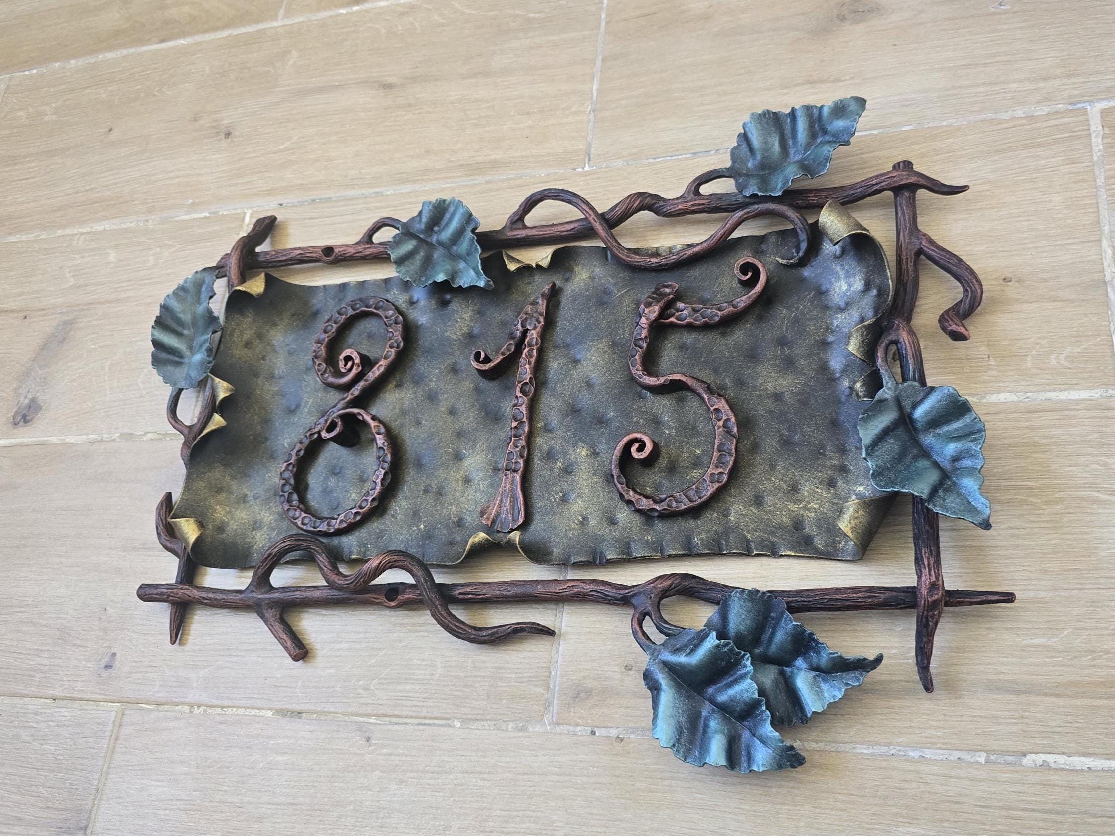 Wrought Iron House Number Sign – Hand Forged Address Plaque with Vines & Leaves – Custom Metal Home Sign
