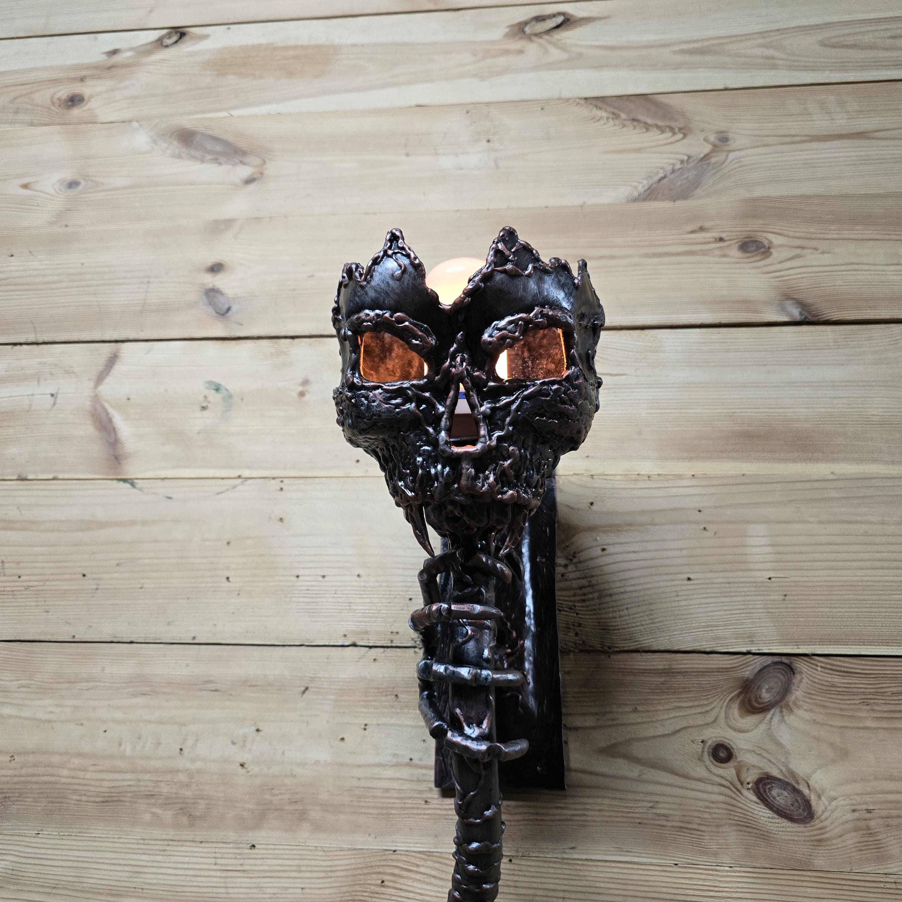 Handmade Gothic Skull Wall Sconce: Metal Torch Lamp, Horror, Halloween Decor